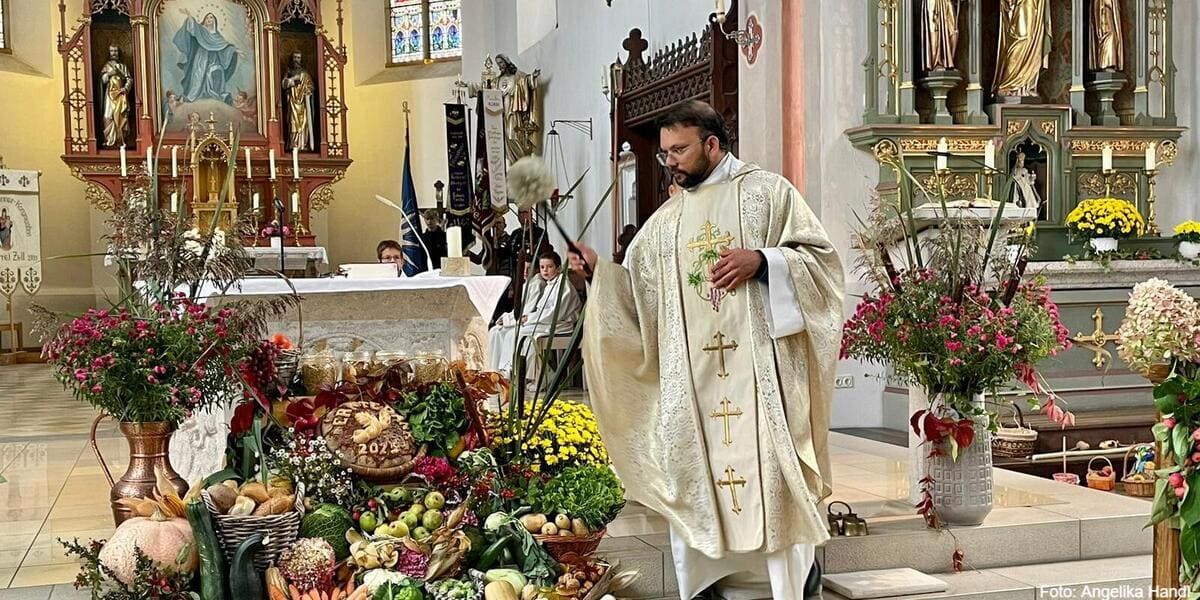 Am Sonntag nach Michaeli (29.9.) wurde auch in Zell das Erntedankfest gefeiert. Die Gläubigen der Pfarrgemeinde zelebrierten einen Dankgottesdienst für die Ernte und die Gaben der Natur. Zuvor trafen sich die Gottesdienstbesucher und einige örtliche Vereine, genauso der Kindergarten „Haus für Kinder“ im Zeller Pfarrhof um gemeinsam zur Pfarrkirche Maria Himmelfahrt zu ziehen. Angeführt von den Ministranten, Pfarrer Tinu Nedumbakaran und der Blaskapelle der Feuerwehr Zell marschierten alle Richtung Kirche.