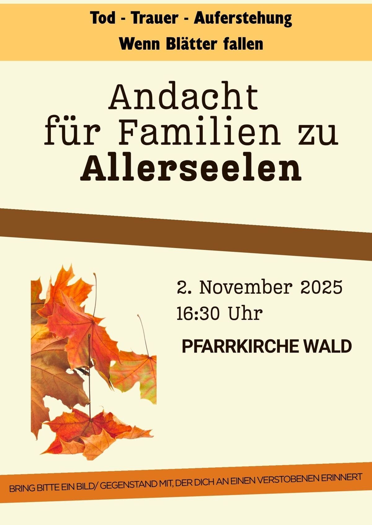 Am Sonntag, den 2. November 2025 findet um 16:30 Uhr in der Pfarrkirche Wald eine Andacht für Familien zu Allerseelen statt. "Wenn Blätter fallen" - Tod - Trauer - Auferstehung. Bring bitte ein Bild oder Gegenstand mit, der dich an einen Verstorbenen erinnert. Dein Team Familienkirche