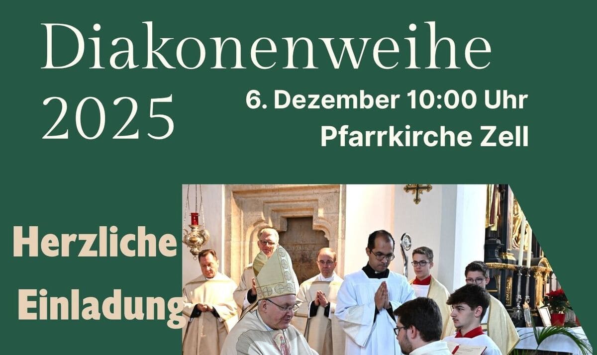 Wir laden die ganze Pfarreiengemeinschaft herzlich ein, an der Diakonenweihe am Samstag, den 6. Dezember 2025 in der Zeller Pfarrkirche teilzunehmen. Gemeinsam können wir durch unser Gebet und unseren Gesang die Weihe mitgestalten, um die Berufung des Weihekandidaten in besonderer Weise zu würdigen.